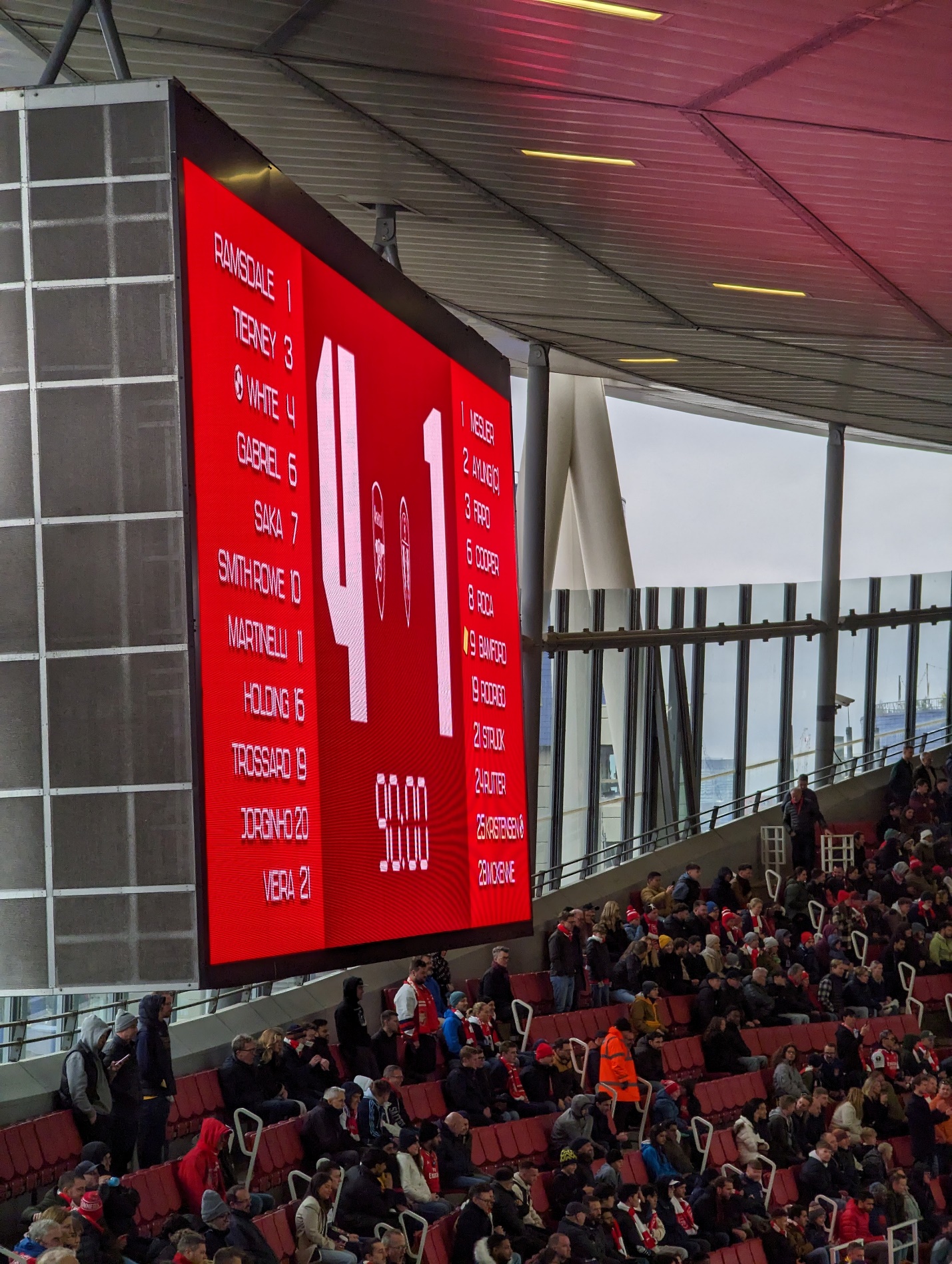 The atmosphere before the game was electric, even though Liverpool was unable to do us any favours. We located our seats high up in the stands and the view was amazing still. Even though we were situated close to the Leeds section, the whole stadium was successful in drowning their chants as the Arsenal steam-rolled them to record a 4-1 victory. Watching Jesus scoring his first goals after his injury, Ben White of all people to pop up at the far post and Xhaka continuing his amazing goal scoring form was really a sight to behold. The stadium cheering as one, the local fans behind us hitting the metal railings to lead us in cheering for our team, it was a perfect game to travel over 14 hours for.