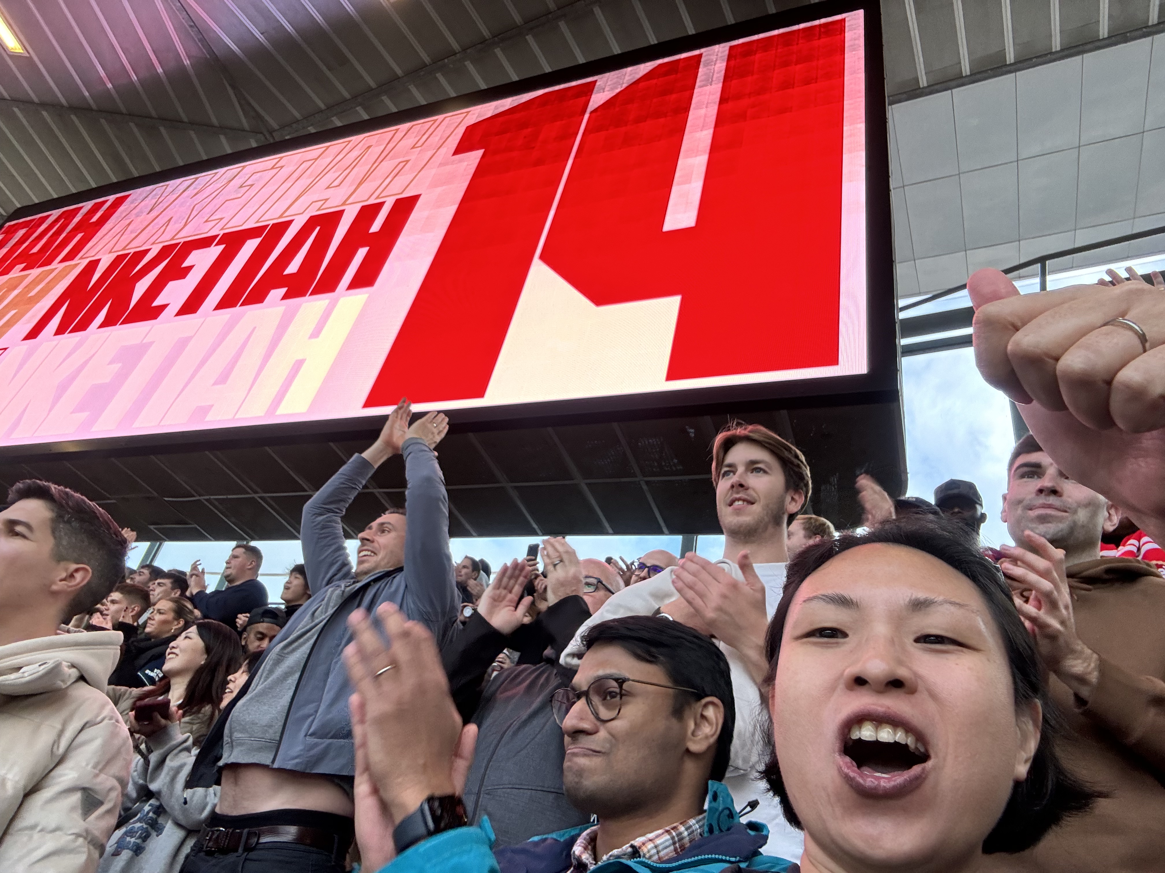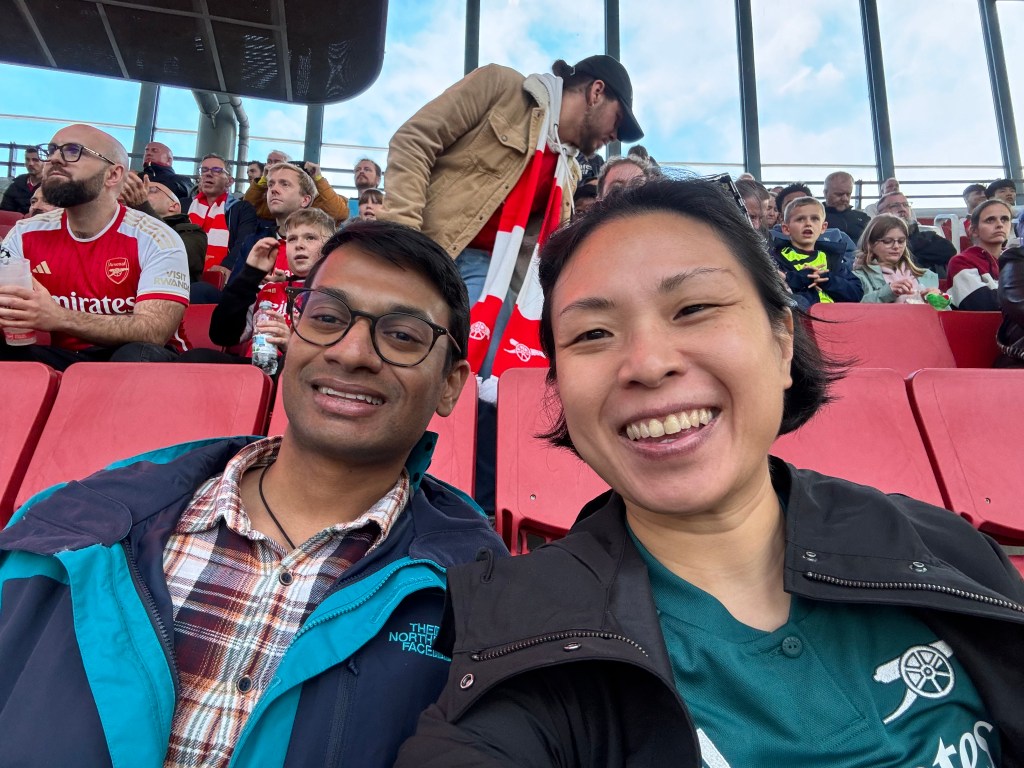 As you all know, it was a goal fest for us. Nketiah was on fire! After we scored 1-0, the fans sang (you guessed it) One-nil to the Arsenal. I didn’t see the need to boo any of the Sheffield players as they were clearly a cut or two below our boys. At the same time, my family was watching the game back in Singapore, celebrating each goal with me and texting to say how lucky I was to be at this match.