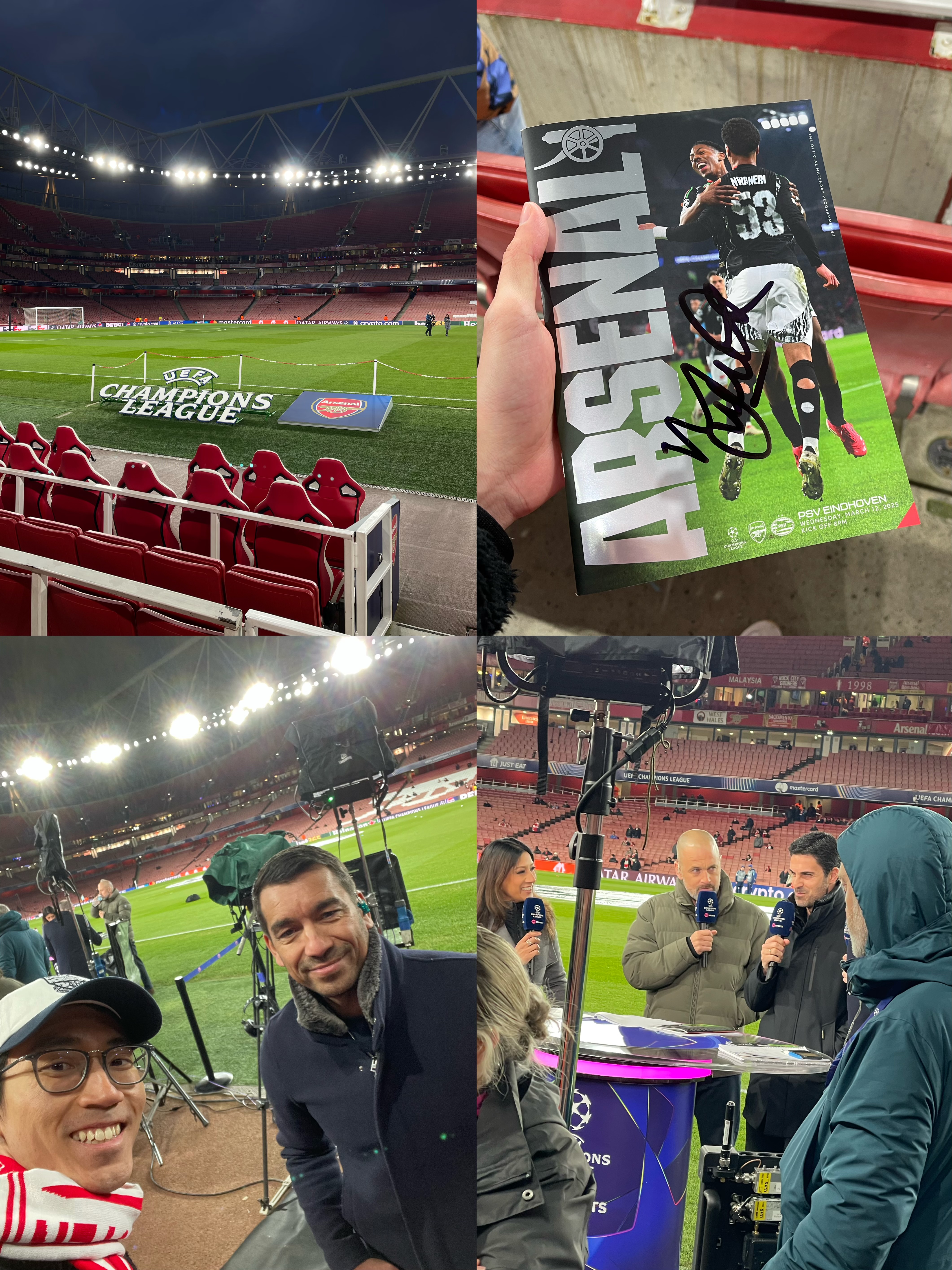European nights at the Emirates always hit differently, but this one felt particularly odd. With Arsenal having already demolished PSV 7-1 in the first leg, the tie felt all but settled, making this clash less about drama and more about sealing our place in the quarterfinals. Still, a Champions League knockout game under the Emirates lights is something to savour. Thanks to Arsenal Singapore, I had the incredible opportunity to be in the stands for this one. But before taking my seat, I had two unforgettable encounters—a quick photo with ex-Arsenal player Giovanni van Bronckhorst and my matchday program signed by the legendary Martin Keown, who was on media duties!