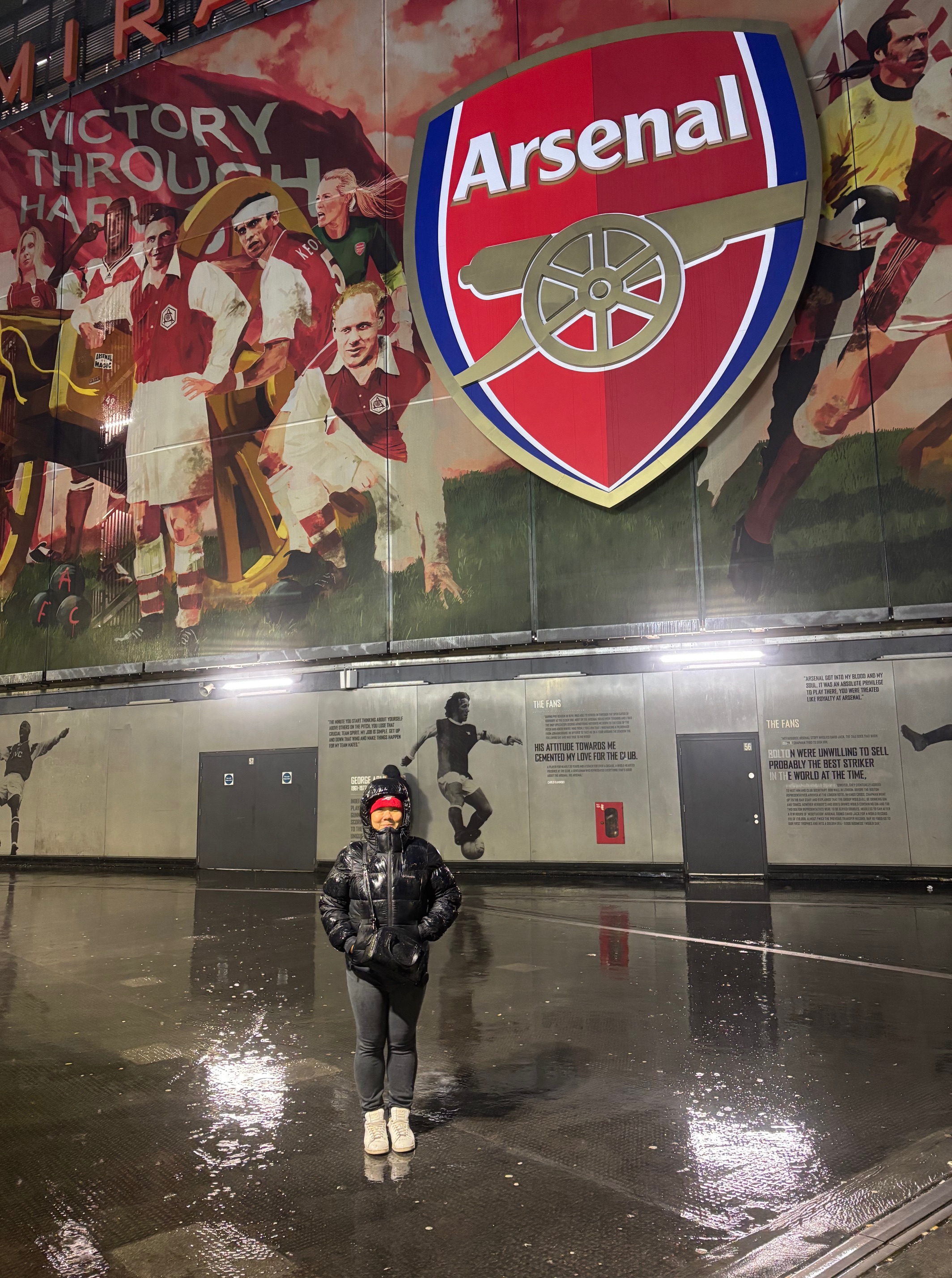 We had wanted to show up early to walk past Highbury Square, get pizza along the way, and visit the Armoury – 4:30pm you’d think. From Finsbury park it was a pleasant walk with a bit of a chilly drizzle, walking past burger stands and stalls selling half-and-half scarves. It turns out we could’ve been earlier, as it was already dark and pattering down when we finally got to take pictures on the grounds (see my waterproof coat struggling in its role at the Henry statue).